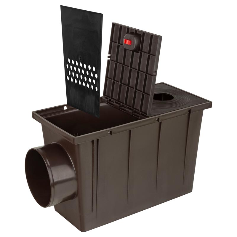 PL gutter settler in gray, brown and black colors, available in horizontal and vertical versions, packaged in cardboard or foil. Effective drainage of rainwater in gutter systems.