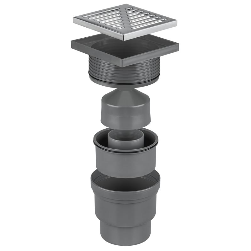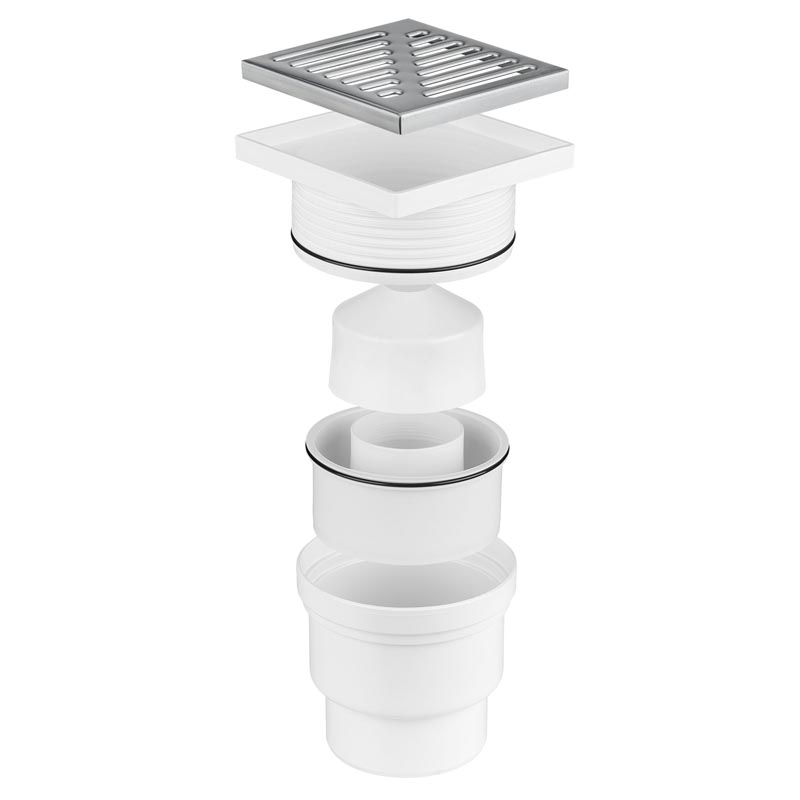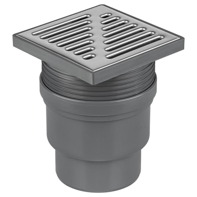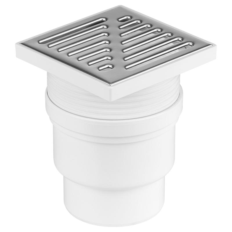 Kratka kanalizacyjna prosta z regulowaną wysokością i rusztem nierdzewnym, dostępny w kolorach białym i szarym. Warianty z pływakiem lub bez.