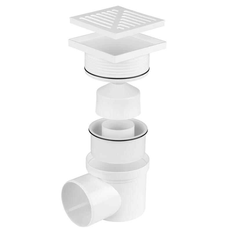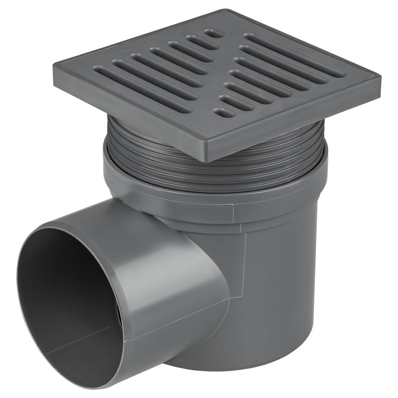 Kratka kanalizacyjna boczna z regulowaną wysokością i rusztem plastikowym, dostępny w kolorach białym i szarym. Warianty z pływakiem lub bez.