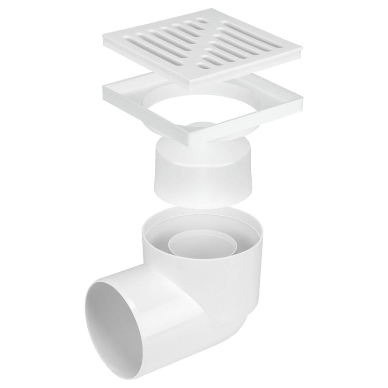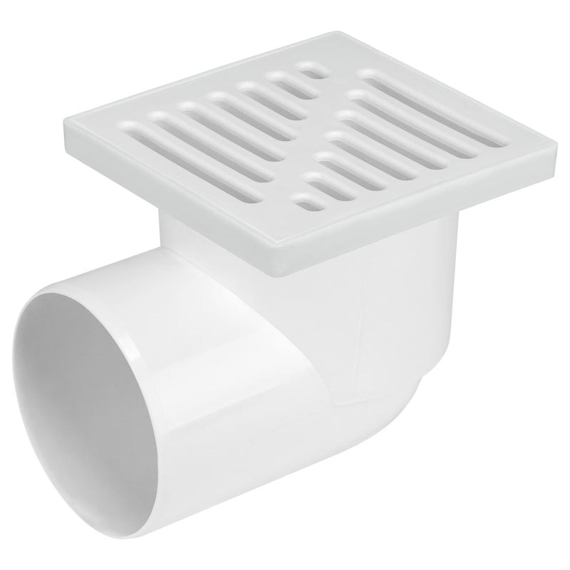 Grătar de scurgere lateral cu grătar din plastic rotativ, disponibil în culorile alb și gri, în dimensiuni de 110/150 x 150 mm. Proiectat pentru evacuarea eficientă a apei în sistemele de canalizare sanitară și pluvială.